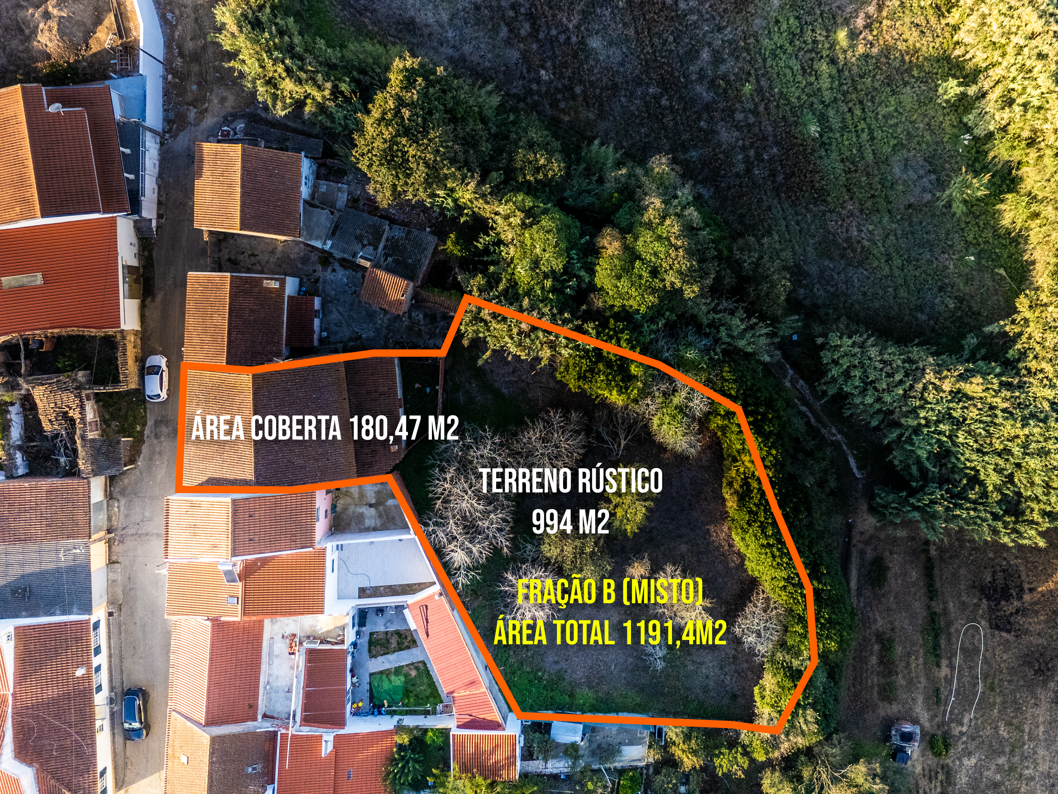 A área total de 1 191m2 ( dois artigos, artigo Urbano com 197M2 e artigo Rústico-Terreno 994M2